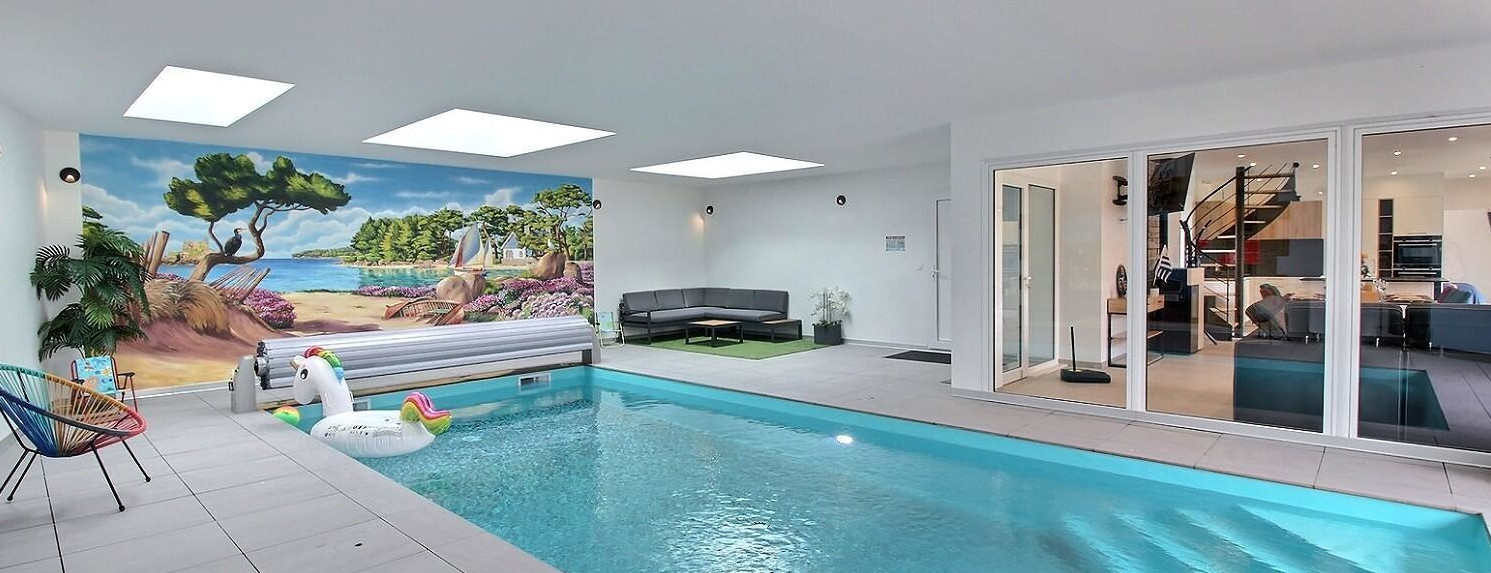 Un espace avec piscine intérieure chauffée toute l'année, (dimensions 8 x 3.5 m, profondeur 1.50 m) et sanitaires.